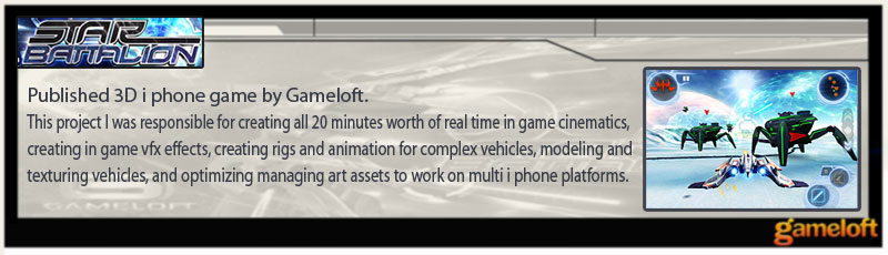 StarBattalion was created and shipped in 8 months. I 3d modeled many vehicles, built vfx, built cincematic sequence, rigged animated.